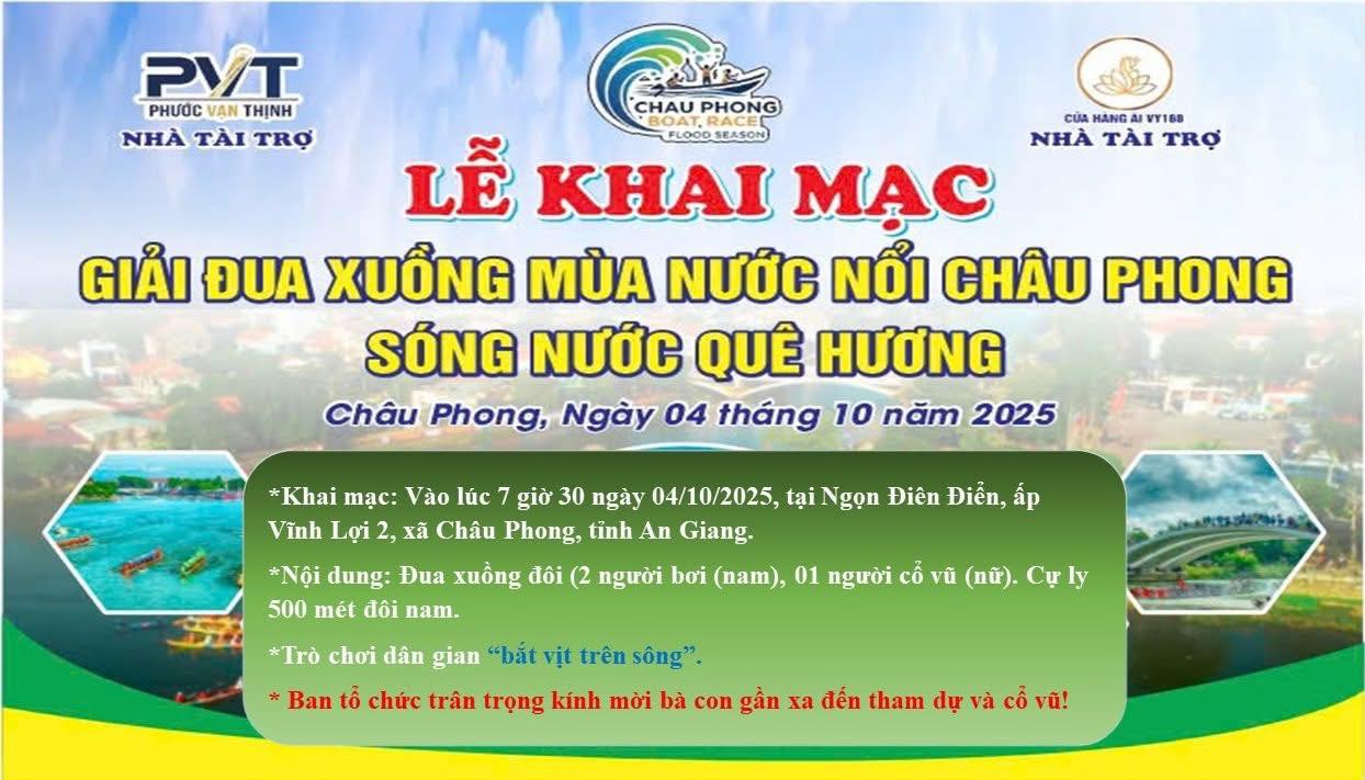 ⏰ Thời gian khai mạc: Thứ 7, ngày 04/10/2025, vào lúc 7h30 sáng, tại Ngọn Điên điển, ấp Vĩnh Lợi 2, xã Châu Phong, tỉnh An Giang.