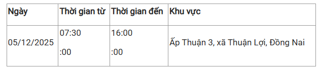 Dưới đây là chi tiết lịch cúp điện Đồng Nai ngày mai: