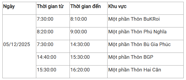Lịch cúp điện Bù Gia Mập