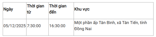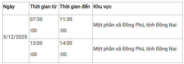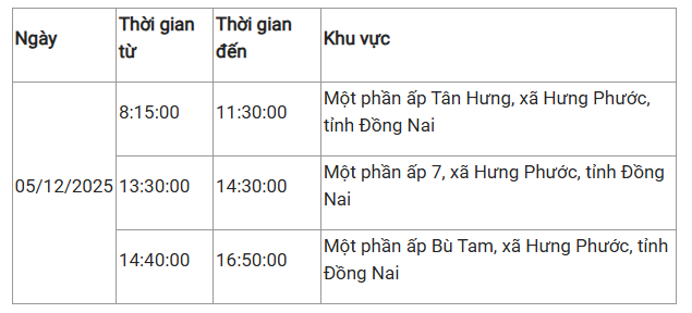 Theo Công ty Điện lực Đồng Nai, ngày mai 5/12 và 6/12, nhiều nơi ở phường, xã trên địa bàn tỉnh sẽ có thông tin ngừng cung cấp điện.