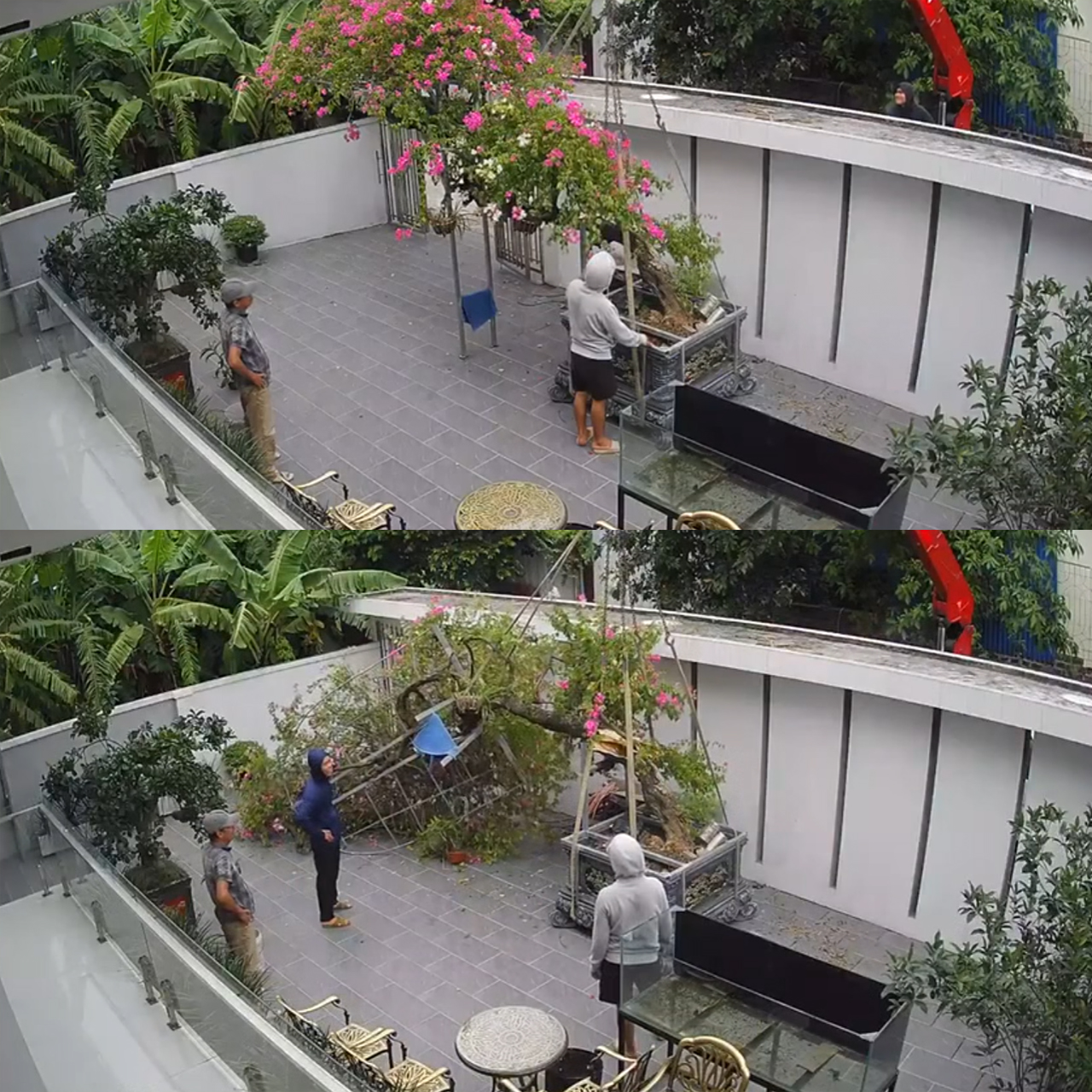 Gia chủ bán cây siêu hoa giấy chục năm tuổi nhờ dịch vụ xe cẩu đến nâng cây nhưng không hiểu mấy anh xe cẩu đặt dây kiểu gì chậu chưa lên mà cây đã lên trước.